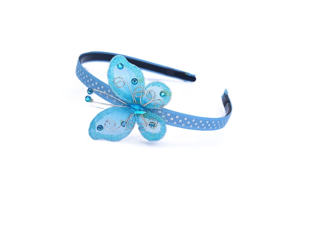 Čelenka světle modré barvy s motýlem ve stejné barvě se hodí jak pro velké, tak i pro malé slečny. Kvalitní rypsová stuha je modré barvy s bílými puntíky. Motýlek má velikost 5 cm a je vyroben z organzy. Designový pásek je lehce magnetický, aby krásně přilnul k čelenkovému základu, který k tomuto motýlkovém designu potřebujete. Tento základ si můžete taktéž koupit zde: /celenkovy-zaklad/